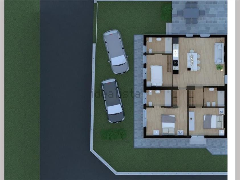 ingresso, zona giorno con angolo cottura, disimpegno, tre camere, tre bagni oltre ad area living esterna.