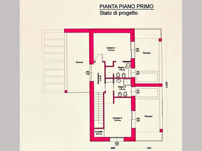 PIANO PRIMO: due camere matrimoniali, bagno e due balconi.